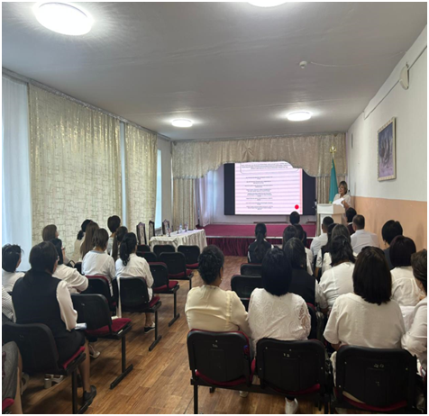 Педагогикалық кеңеске «Абай облысының білім басқармасы» ММ «Облыстық инновациялық-әдістемелік орталығы» КММ басшысының орынбасары Ахметова Гульфия Мажитовна және Аягөз аудандық білім бөлімінің әдіскері Тусупова Карлыгаш Абильмансуровна қатысып жаңа оқу жылына сәттілік тіледі.