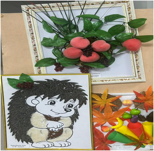 Көрмеге 1–4 сынып оқушыларының табиғи материалдардан жасалған қолөнер туындылары мен аппликациялары, сондай-ақ 5–8 сынып оқушыларының сурет және композициялық жұмыстары қойылды.